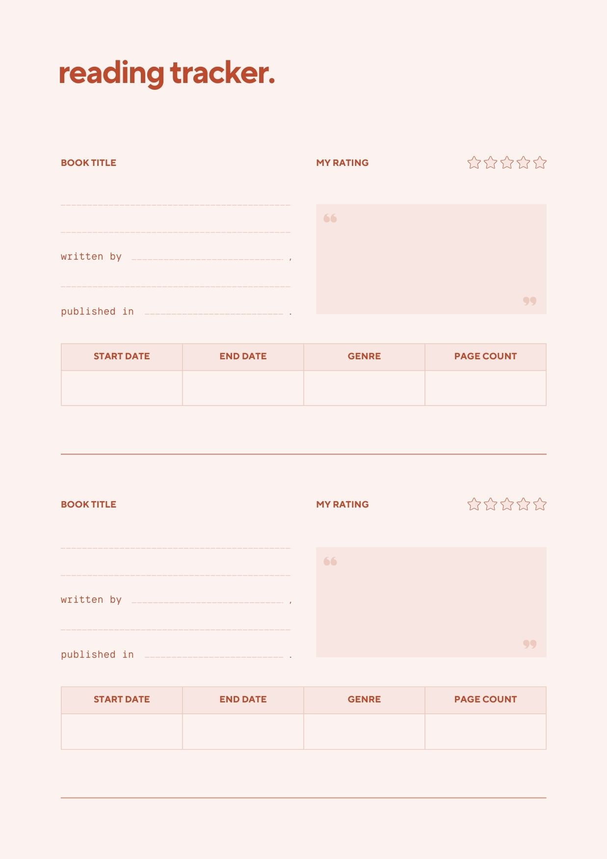 The Reading Tracker template is an invaluable tool for avid readers and book enthusiasts who want to keep track of their reading journey. It provides sections for listing books you plan to read, monitoring your reading progress, and reflecting on key takeaways or personal insights from each book. The tracker helps you set reading goals, whether it’s a specific number of books or genres, and stay motivated by visualizing your accomplishments. By consistently using this tracker, you can maintain a structured approach to your reading habits, organize your literary interests, and ensure that you continually engage with your favorite books and authors. Perfect for individuals who enjoy reading as a hobby or part of their personal development.