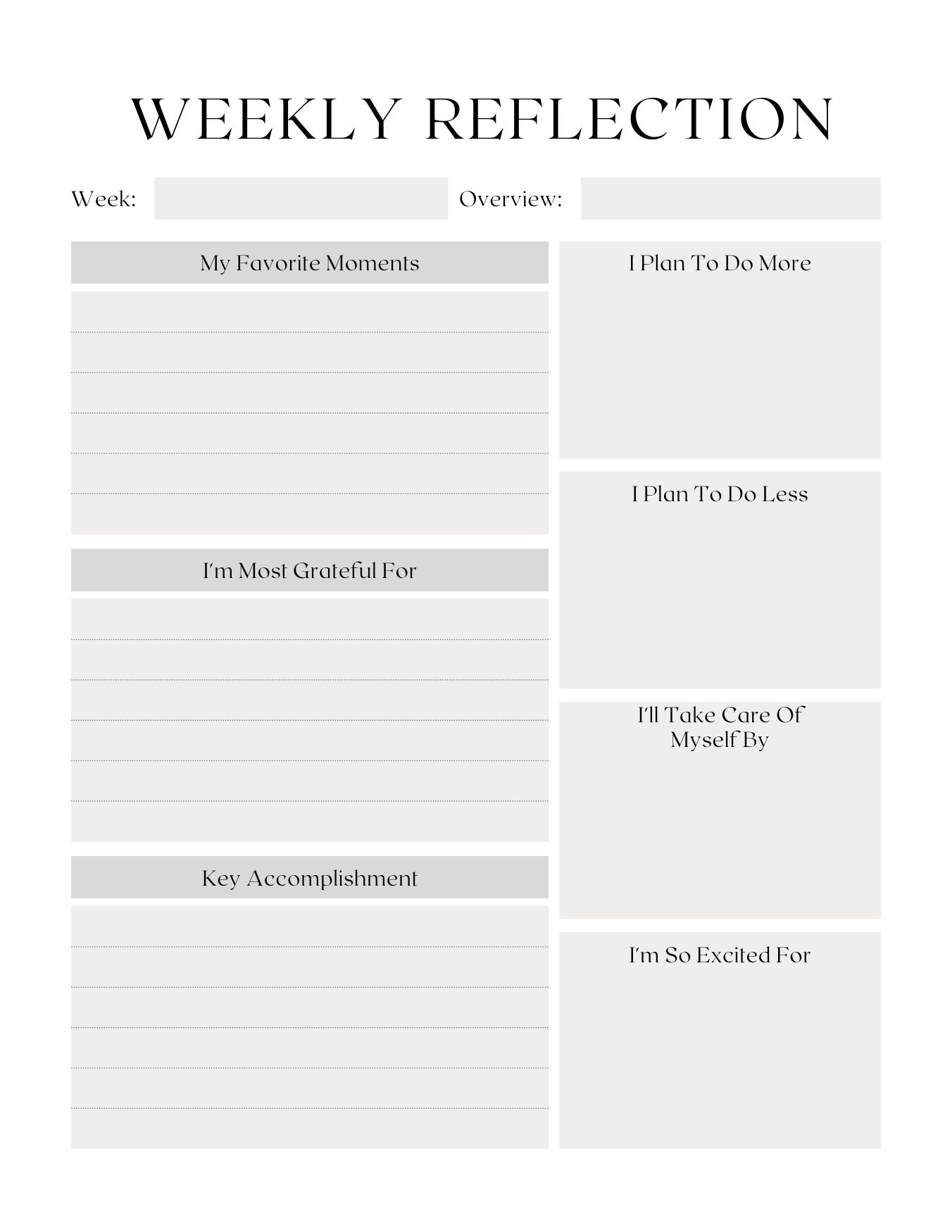 “This Weekly Reflection Journal has been a game-changer for my personal growth journey. Its thoughtful prompts guide me through a meaningful self-inquiry each week, helping me identify patterns, set intentions, and track my progress. The printable format allows me to customize and organize my reflections, fostering a sense of ownership and accountability. I highly recommend this journal to anyone seeking a structured approach to personal development and self-discovery.”